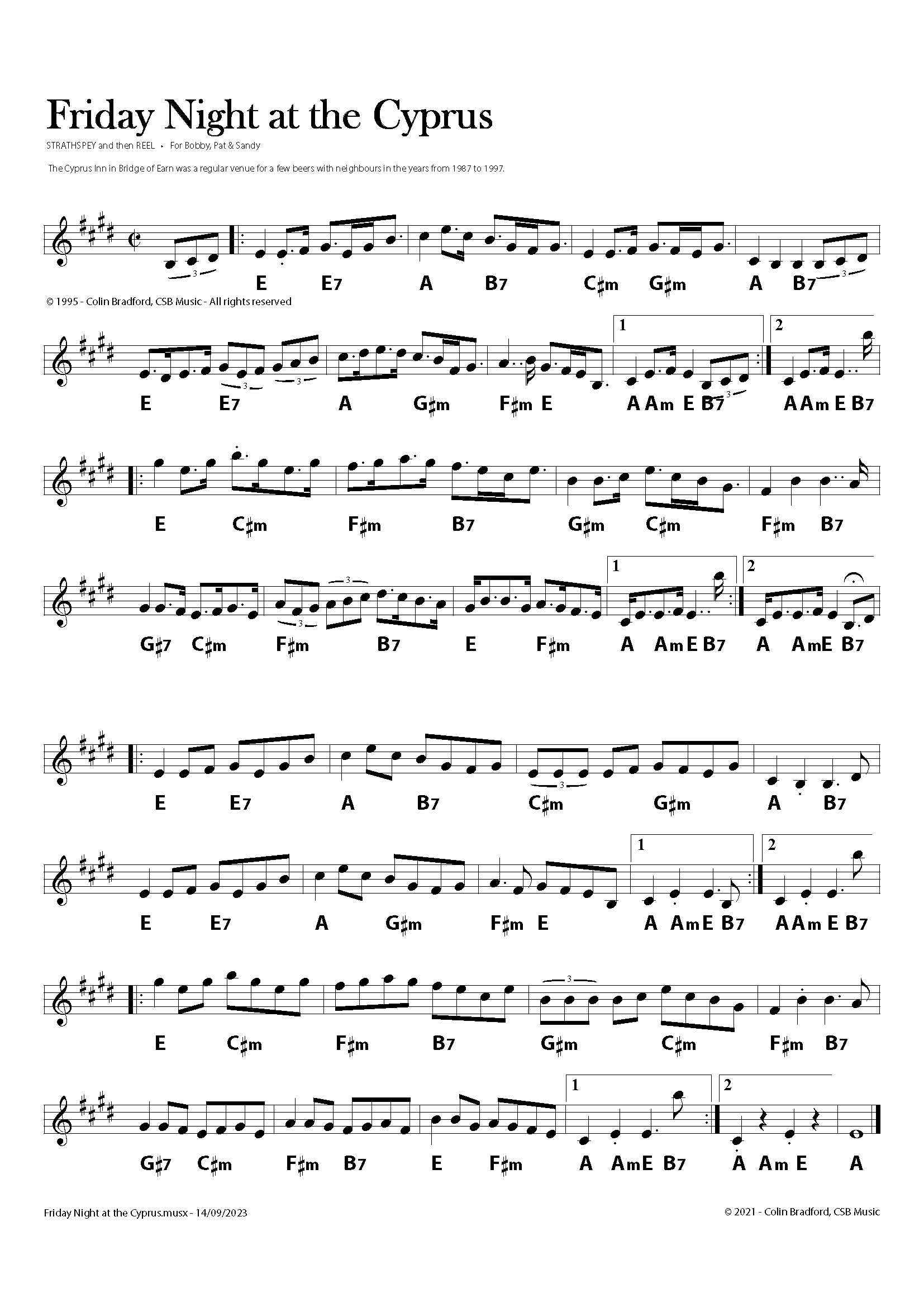 | Friday Night at the Cyprus | c1995 | The original key was F but the key of E is good fun and keeps the fiddle in 1st position. | ||||